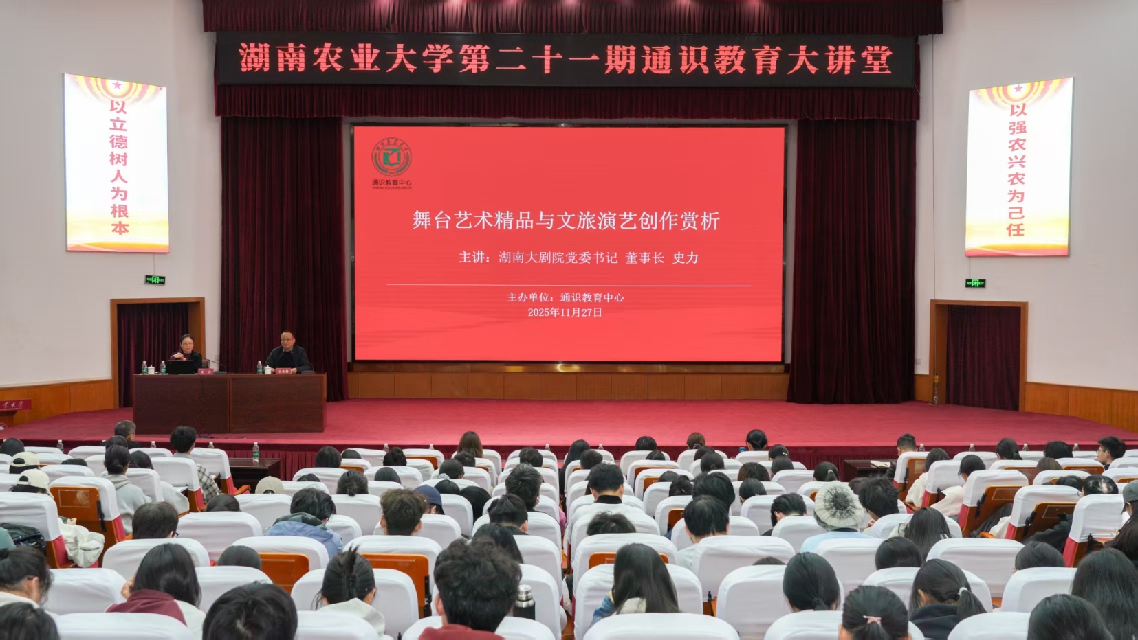 本网讯(通识教育中心 郑若菡)11月27日下午,我校第21期通识教育大讲堂在修业讲堂开讲。湖南大剧院党委书记、董事长史力应邀作题为《舞台艺术精品与文旅演艺创造赏析》的专题讲座。通识教育中心主任王永昌主持讲座,全校300余名师生参加。
