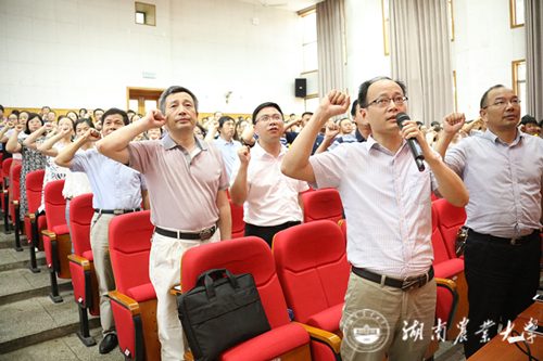 本网讯(机关党委 李婵) 6月28日下午,在中国共产党建党97周年之际,机关党委开展了一次温馨而隆重的集体政治生日纪念活动,300多名机关党员在学术报告厅参加“党员党课、新党员宣誓、党员重温入党誓词”主题党日活动。活动由机关党委书记王山群主持。