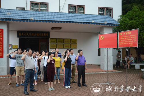 本网讯(图书馆 李煦)图书馆教工第一、第四党支部为深入了解农村基层组织建设和产业发展情况,充分发挥图书馆在文化扶贫和乡村振兴中的重要作用,将《改造传统农业》阅读推广活动融入到提升图书馆扶贫攻坚当中。7月5日上午,教工第一、第四党支部联合长沙县青山铺镇天华村党支部,开展了支部主题党日活动。支部全体党员参加了本次活动。