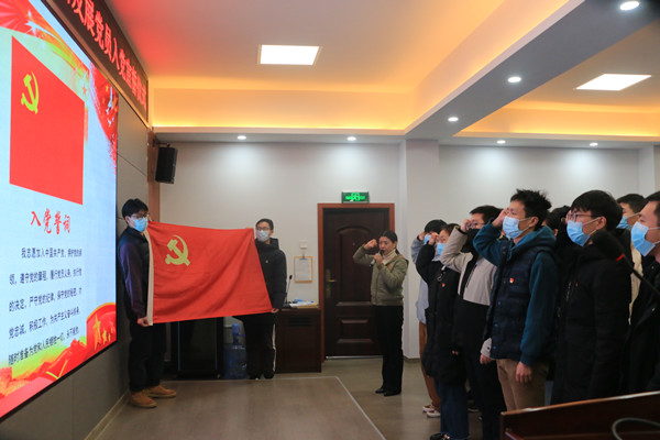 谢倩带领新发展党员入党宣誓,全体新党员右手握拳,面向党旗,庄严宣誓。短短80字的入党誓词,掷地有声、铿锵有力,是一代代中国共产党人对党无限忠诚的铮铮誓言。