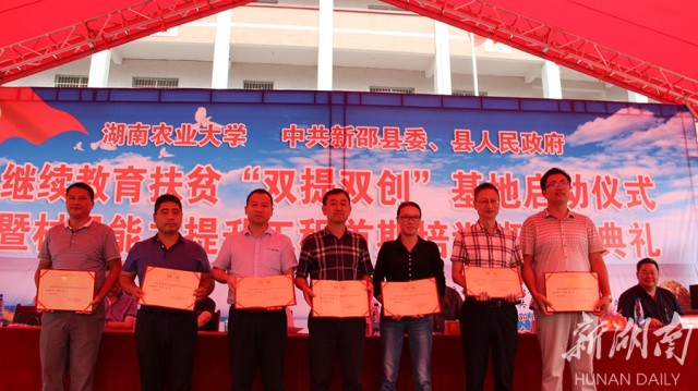 9月23日,湖南农业大学与新邵县校地共建继续教育扶贫“双提双创”基地启动仪式在新邵县龙溪铺镇举行。