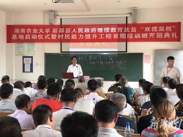 常言道:“扶贫先扶志,扶贫必扶智”。“双提双创”,即提高村民能力和学历,提供创新驱动和创业指导。在湖南省扶贫办指导支持下,湖南农大继续教育扶贫“双提双创”基地以新邵县龙溪铺镇为选址,以湖南农大继续教育学院为支撑,主要围绕农民综合素质提升工程、农民职业技能培训工程、农业生产技术创新工程、农村社区管理创新工程进行建设。