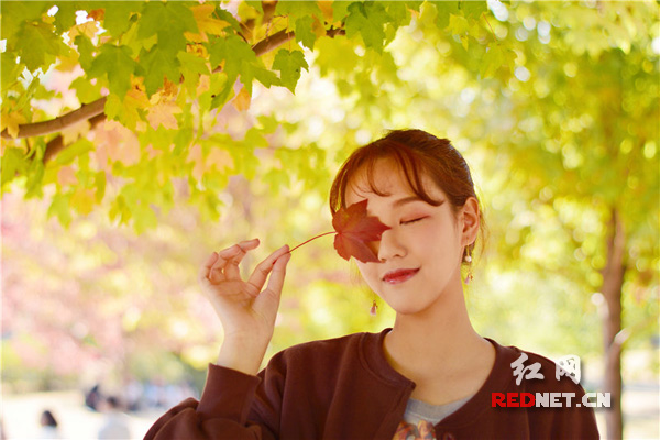 湖南农业大学大三学生盛安琪:大三了,你走在枫叶路上,感慨错过这次的红枫,就要再等一年,于是你笑着和好友说,帮你拍一张照片吧。