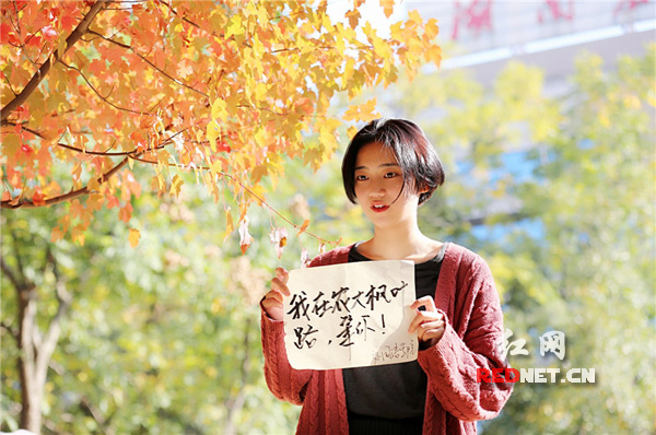 湖南农业大学大四学生孙佳思:刚从图书馆出来的你,走在枫叶路上,回过头对室友说,一起努力考研吧!