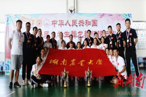 新湖南客户端7月18日讯 (通讯员 喻诚 记者 胡泽汇) 7月12日至17日,由教育部大学生体育协会主办的第十一届中国大学生舞龙舞狮锦标赛在广西师范大学雁山校区举行,来自全国56所高校的1194名参赛选手同场竞技。湖南农业大学派出男子、女子2支舞龙队,参加了乙组(体育专业组)男子舞龙自选套路、舞龙规定套路和女子舞龙规定套路三个项目的角逐,均勇夺金牌,连续三年在大学生龙狮锦标赛(体育专业组)中均夺得3枚金牌,连续三年成为“大满贯”得主。
