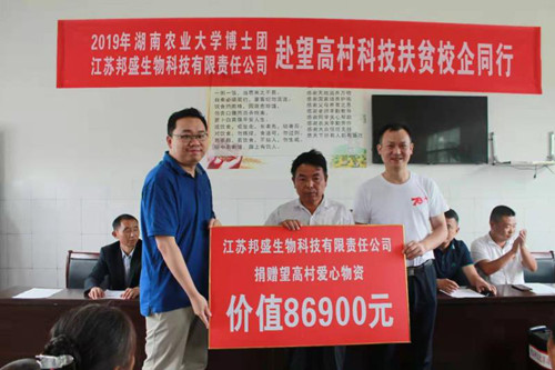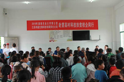 7 月 13 日上午,湖南农业大学植物保护学院 " 三下乡 " 博士团与江苏邦盛生物科技有限责任公司校企同行科技扶贫活动在花垣县望高村村部正式启动。湖南农业大学植物保护学院副院长李有志、副书记汤庆熹,江苏邦盛赵巍先生、花垣县农业局副局长石远明、麻栗场镇党委书记麻建平、人大主席吴晓华以及望高村小学校长、驻村扶贫工作队、村支两委、村民代表、留守儿童以及博士团全体成员近 200 人来到了活动现场。扶贫工作队队长唐文源主持本次活动。