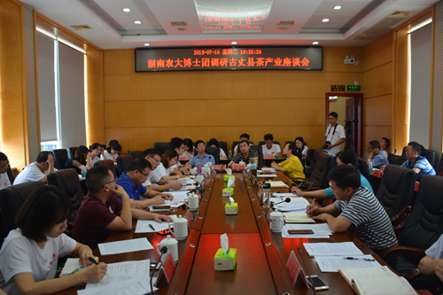 三湘都市报·新湖南客户端7月17日讯(记者 黄京 实习生 陈英 通讯员 莫华 杨亦民 杨毅超) “山城那个古丈县茶叶清醇中,别有一种芳馥之气……” 沈从文在湘西古丈县小憩时,写下了这样的句子。古丈县的茶不仅是文人笔下的焦点,如今也成为这个贫困县的支柱产业之一。如何把古丈茶产业做大做强,使其在脱贫攻坚战中发挥优势?昨日上午,湖南农业大学商学院“三下乡”博士团走进古丈县,召开“湖南农大调研古丈县茶产业座谈会”,立足茶产业发展,为古丈县产业脱贫建言献策。
