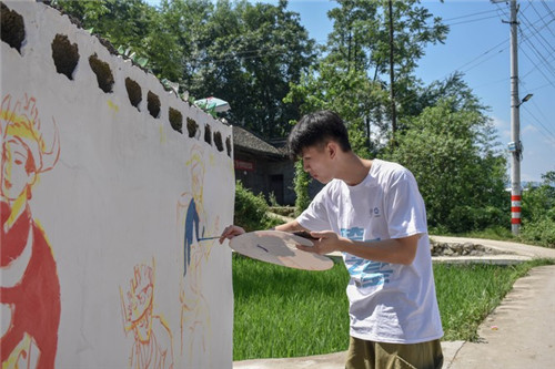 本网讯 7月9日至7月25日,湖南农业大学体育艺术学院师生志愿者们在湘西花垣县麻栗场镇望高村进行暑期精准扶贫下乡。其以“苗族▪农耕”的墙绘为主题,通过展现苗族传统文化生活为望高村民生动地传递社会主义核心价值观。