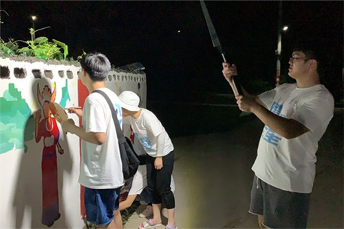 自7月9日志愿者们到达望高村动手绘制,至7月下旬完工,以肖青波老师带队的八名师生志愿者在望高村的砖土墙上工作了一个多星期。从测量数据、调制颜料、描绘彩图、填充色彩到后期维护,每一个环节他们都一丝不苟、兢兢业业。烈日下,汗流浃背也丝毫不影响志愿者们精细描图;细雨中,也要踩着泥坑钻进遮雨布紧急处理墙料的修补。在墙面绘制过程中,为了避免连续几日的阴雨天气影响工期,志愿者们甚至晚上举着手灯进行创作,他们的专业精神和不畏劳苦的付出,让望高村民深受感动。