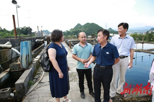 (吴教授/左一和曹校长/右二 了解鲟鱼成长情况)