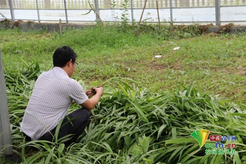 图为杨华副教授考察白芨种苗。中国青年网通讯员 曾泽南摄