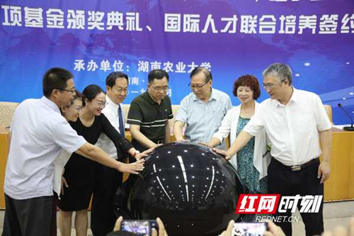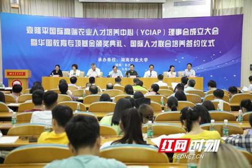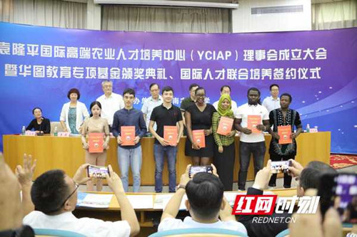 袁隆平国际高端农业人才培养中心(YCIAP)理事会成立大会暨华图教育专项基金颁奖典礼、国际人才联合培养签约仪式在湖南农业大学举行。何纲跃/摄