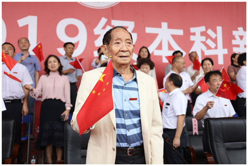 典礼开始,袁隆平院士第一个发言。他刚一开嗓,现场2万名师生便发出尖叫声和掌声,向袁院士表示最崇高的敬意。“面对活泼开朗、意气风发的你们,我希望不是以长辈身份,而是作为朋友来与你们交流。”袁隆平以“朋友”的身份和大家谈起了自己的两个梦想:“第一个梦是禾下乘凉梦,这是追求水稻的高产梦;第二个梦是杂交水稻覆盖全球梦,我始终都还在努力使梦想成真,也寄希望与你们共勉来共同实现这两个梦想。”