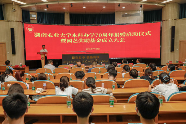 本网讯(校友办 周燕)9月24日下午,学校本科办学70周年捐赠启动仪式暨园艺奖励基金成立大会在生命科学楼国际会议厅举行。学校党委书记陈弘,中国工程院院士、校长邹学校,校党委副书记段美娟;湖南湘研种业有限公司董事长何久春,总经理刘荣云;湖南兴蔬种业有限公司执行董事张大伟,总经理邹家华;江苏镇研种业有限公司董事长卢国强;宁夏泰金种业有限公司董事长裴卓强;湖南省湘江源农业科技发展有限公司总经理邓召利;西藏绿之源现代农业科技股份有限公司总经理王真君出席仪式。学校教育基金会、园艺学院负责人及校友、师生代表参加。段美娟主持仪式。