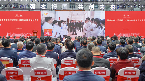 邹学校作题为《强农报国 共创未来》的大会致辞。他表示,120年来,为时养器始终是湘农人的坚定信念,朴诚奋勉始终是湘农人的精神内核,求实创新始终是湘农人的价值追求,强农报国始终是湘农人的使命担当。新时代的湘农,坚守立德树人之本,培育了大批知农爱农新型人才;集聚科技创新之势,加速了“双一流”建设步伐;扛牢服务“三农”之责,书写了助推乡村振兴的湘农篇章;绘就文化校园之美,构建了和谐文明的精神家园;坚持开放办学之道,开创了国际交流合作的新局面。他强调,展望未来,我们将主动求变,以高水平农业人才培养为强国建设提供有力支撑;挺膺担当,以农业科技创新赋能“国之大者”;守正创新,努力将优秀传统文化转化为师生员工的精神内涵和品性追求;胸怀天下,以合作交融推动构建人类命运共同体,汇聚全校师生员工和广大校友的磅礴力量,踔厉奋发、勇毅前行,在强国建设、民族复兴的新征程上再作新贡献、再创新辉煌。
