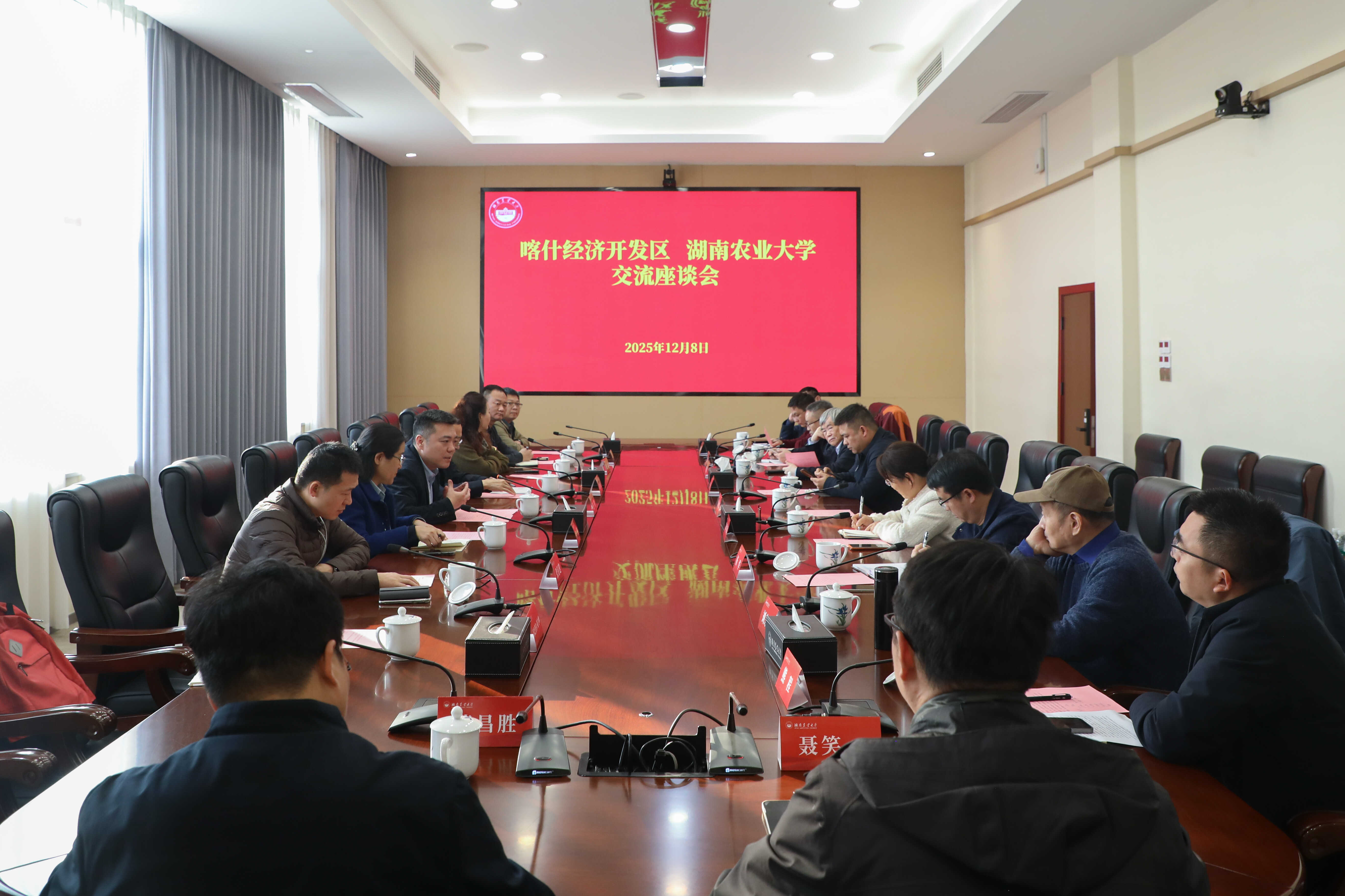 12月8日,喀什经济技术开发区党工委委员、管委会副主任池明一行访问我校,围绕深化校地合作、推动区域协调发展进行交流座谈。我校党委副书记、校长、中国工程院院士邹学校,校党委副书记陈光辉出席,社会服务处处长朱华武主持会议。喀什经开区相关负责人及重点企业代表、学校相关职能部门与学院负责人、专家代表共同参与。