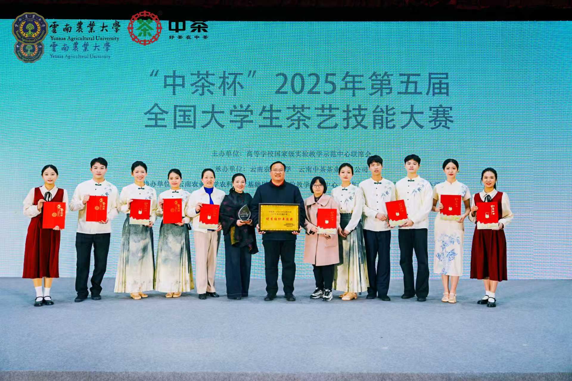 12月10日至12日,由高等学校国家级实验教学示范中心联席会主办、云南农业大学、云南中茶茶业有限公司联合承办的2025年“中茶杯”第五届全国大学生茶艺技能大赛决赛在昆明举行。我校茶学专业学生在本次比赛中获一等奖5项,二等奖1项,三等奖2项,学校获“优秀组织单位奖”。