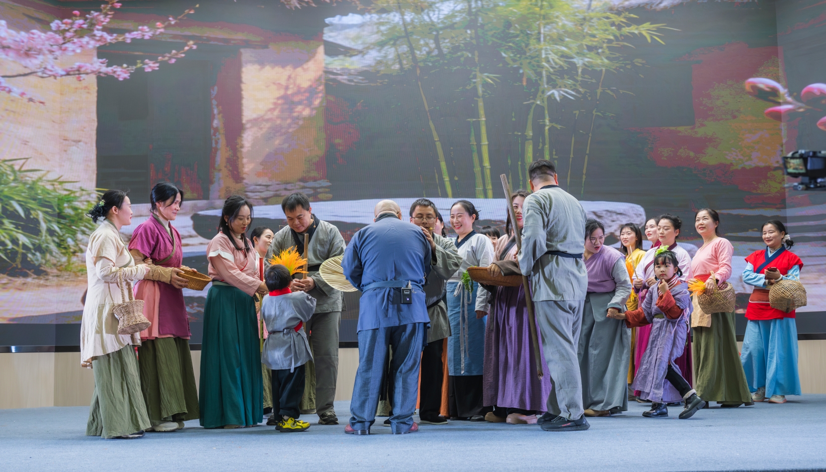 据悉,“一校一书”读演剧场以陶渊明经典名篇《桃花源记》为蓝本改编,打破传统阅读模式的边界,创新性地将诵读、音乐与表演融为一体。活动紧扣“追寻与失落,理想与现实的永恒对话”核心主题,以古典诗意的艺术风格为基调,通过沉浸式诵读传递文本深层韵味。舞台之上,长卷轴灵动变换,桃花枝点缀其间,参演者身着古风元素的素雅服饰,以肢体语言和饱含情感的诵读,带领观众穿越千年时光,走进那个与世无争的理想家园,让经典文本在舞台上焕发新生。舞台剧场的创新演绎不仅让经典可感可触、直抵人心,更让图书馆“经典、精读、经世”的阅读推广理念落地生根。
