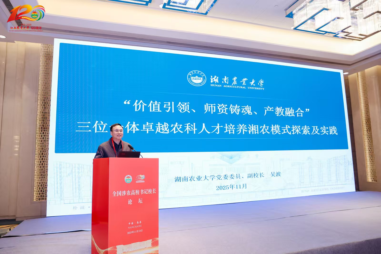 本次论坛以“勇担时代使命,推进教育、科技、人才协同发展”为主题,来自全国28所知名涉农高校的领导、专家围绕高水平农业科技创新、高质量农业人才培养等主题开展深入研讨。吴波在报告中介绍了我校办学历史和近年来高质量发展取得成效,深入剖析了当前我国农科人才培养面临的普遍性挑战,并系统阐述了我校构建的“三位一体”卓越农科人才培养模式。该模式聚焦三个核心维度:在价值引领上,以袁隆平科学家精神为感召,构建起贯穿育人全程的“大国三农”思政教育体系;在师资建设上,打造由院士领衔、既立足前沿又扎根实践的“顶天立地”型师资队伍;在培养机制上,着力构建“全覆盖、全链条、全过程”的产教融合协同育人体系,全面助推卓越农科创新创业人才的培养。