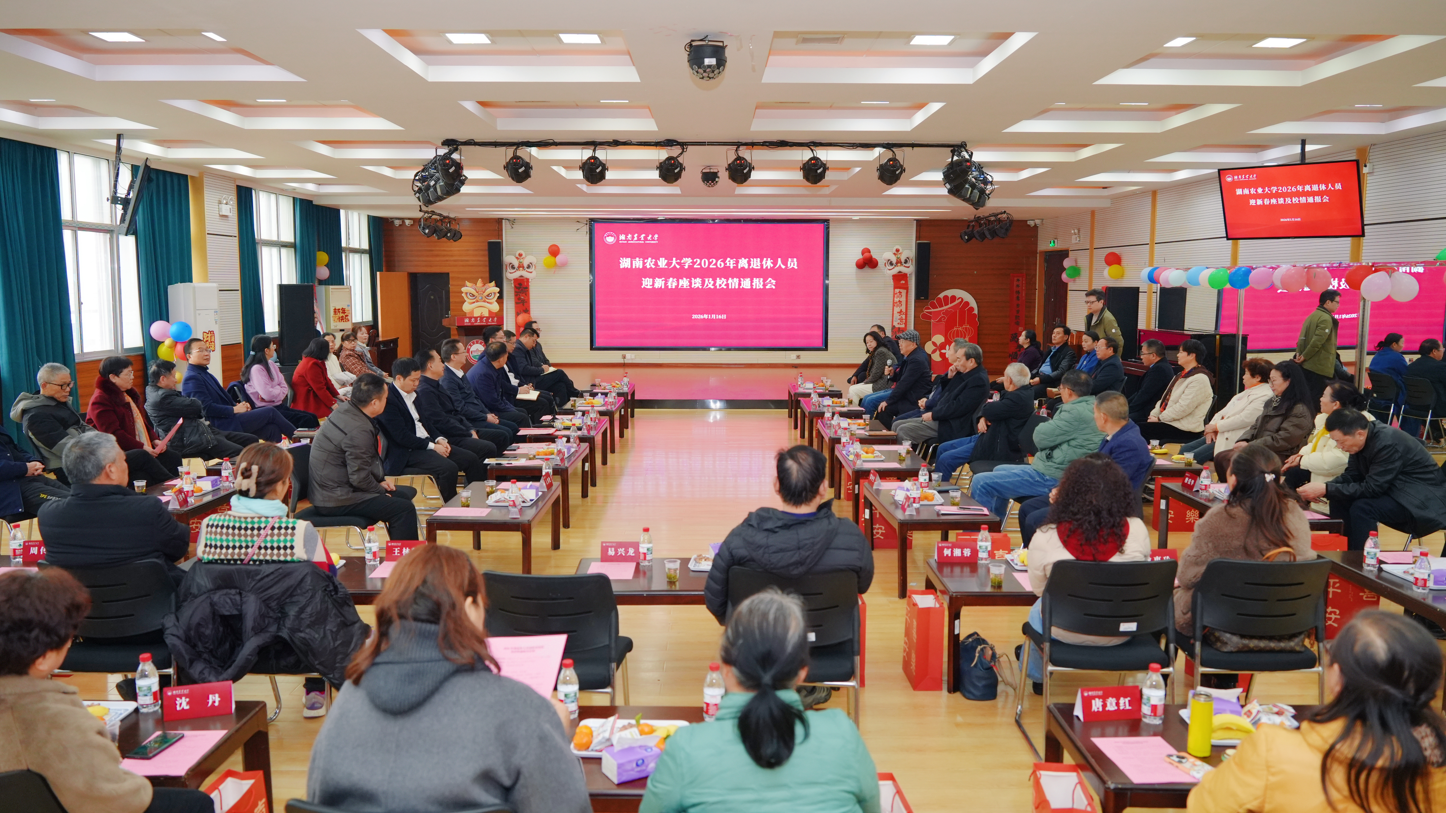 1月16 日下午,2026年离退休人员迎新春座谈及校情通报会在教工服务中心北五楼多功能厅举行。校党委书记兰勇,党委副书记、校长、中国工程院院士邹学校,党委副书记陈光辉,相关职能部门负责人及40余名老同志代表、离退休工作处全体工作人员参加,陈光辉主持会议。