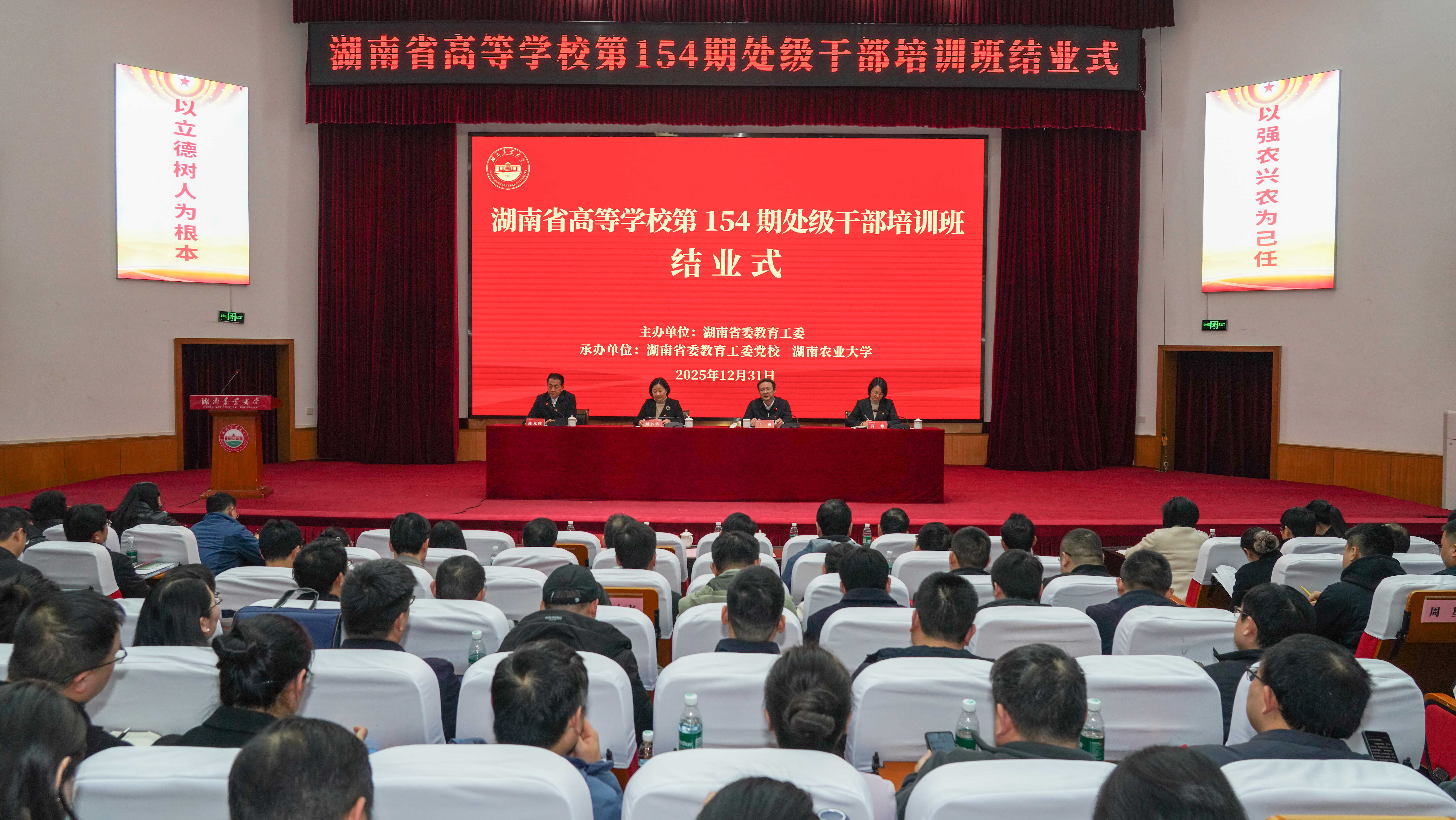 12月31日下午,湖南省高等学校第154期处级干部培训班结业式在修业讲堂举行。校党委书记兰勇,省委教育工委组织部部长刘书华,湖南省高校干部培训中心主任、书记冯臻出席,校党委副书记陈光辉主持结业式。