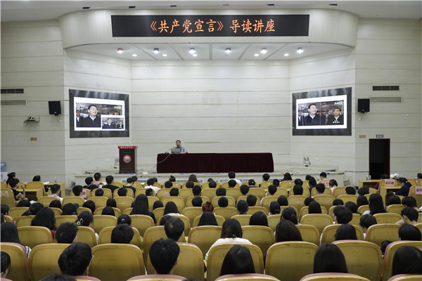 姚元军从《共产党宣言》的出版和翻译情况,产生的历史背景,恩格斯、列宁对其评价,《共产党宣言》与中国革命、建设、改革等方面导入讲座,详细解读了七篇序言和四个章节,阐述了党的产生、党的性质、党的理论主张、党的最终奋斗目标,强调《共产党宣言》是一部揭示人类社会发展规律、永葆斗争和革命精神、坚守和秉持人民立场及紧跟时代的与时俱进之作,并提出《共产党宣言》所蕴含的斗争和革命精神永不过时,大学生要加强对马克思主义经典著作的学习研究。