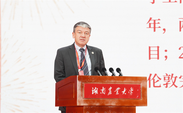 英国格林威治大学副校长、教授Andrew Westby代表国外大学致辞。他表示,格林威治大学为能成为湖南农业大学的合作伙伴而感到自豪,过去二十年,两校密切联系、深入合作,取得了骄人的成绩,希望将来合作可以朝着更深更广的方向拓展。