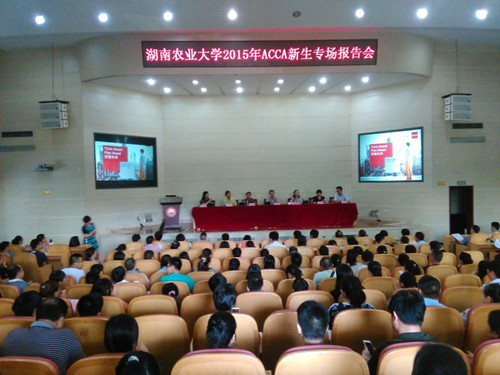 本网讯(商学院学研产办公室 石勇)9月10日上午,湖南农业大学2015年ACCA新生专场报告会在图书馆大成厅举行。会议由商学院党委书记李阿利主持。商学院院领导、ACCA合作机构负责人以及ACCA项目教学班的新生及家长参加了报告会。