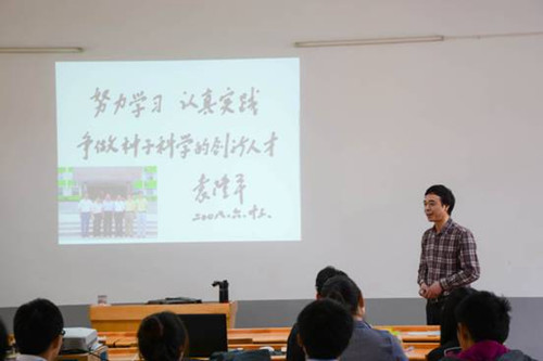 上午9时,张海清院长在基地自习室给种子专业学生上课,为同学们讲解种子生产管理及育种等内容。下午14点,张院长召开2013级隆平创新实验班座谈会,为学生答疑解惑,加强基地安全问题教育,进行思想工作指导。自2014年以来,农学院一直致力于建设首届实验班,推行各项创新制度。张院长还就考研、就业等问题进行了深入解析:考研应遵循“基础研究与应用研究相结合”的原则,学生现阶段应尽快确立自己的目标,为毕业就业或考研做好准备。张院长就目前国内的专业就业前景给同学们提出了建议。