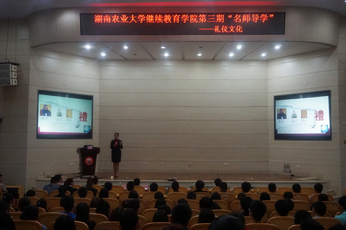 本网讯(继续教育学院 黄丹)5月11日晚,继续教育学院第3期名师导学专题讲座在图书馆大成厅举行。本期名师导学的主讲嘉宾是校团委书记覃红燕,讲座的主题为“礼仪文化”。继续教育学院院长孙焕良、副院长熊格生、田建湘、李毅、李方一出席本次讲座,讲座由孙焕良院长主持。