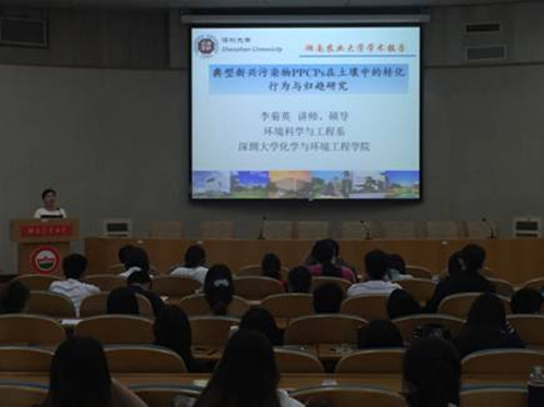 张培新院长详细介绍了深圳大学环境科学与工程学院办学进程、已有的办学条件和学生培养情况,热情欢迎湖南农业大学本科生到深圳大学继续深造。深圳大学环境科学与工程系李菊英博士作了题为“典型新兴污染物PPCPs在土壤中的转化行为与归趋研究”的学术报告。在座的师生积极互动,与张院长一行就相关专业问题进行了深入的交流、探讨。