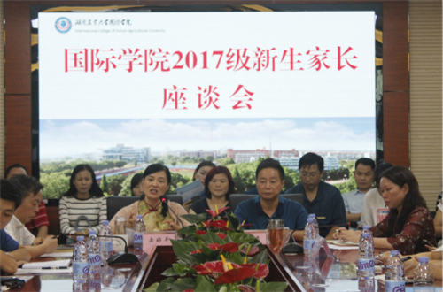 本网讯(国际学院 龙秋雨)为增强与新生家长的联系,帮助了解学院办学特色。9月12日,国际学院于12教107室举行2017级新生家长座谈会。学院党委书记聂庆益、院长岳好平、副院长黄春来、张玉上以及英国格林威治大学中国代表办事处冯海玥出席会议,130余名新生家长参加了此次座谈会。院党委副书记兼副院长邓益成主持。