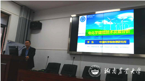 本网讯(理学院 吴雄伟 邓奇)应湖南农业大学理学院的邀请,国家杰青、中科院物理所李泓研究员于2017年10月16日下午莅临我院,以“电化学储能技术发展分析”为主题作学术报告。报告会由理学院吴雄伟副教授主持,逾200名师生参加了本次报告会。