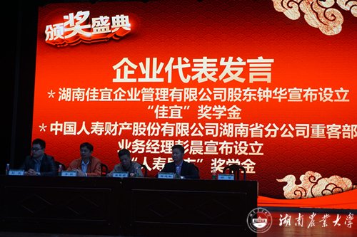 湖南佳宜企业管理有限公司股东钟华、中国人寿财产股份有限公司湖南省分公司客户部业务经理彭晨在典礼上宣布,他们将每年分别在湖南农大继续教育学院设立2万元“佳宜”奖学金和2.5万元“人寿励志”奖学金,奖励学院的优秀学子,同时也希望学院的优秀学子成为公司的得力干将,实现企业和学校的共赢。