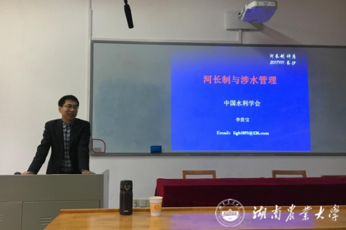 本网讯(工学院 王辉 陈潇岳)11月11日下午,工学院举办了“河长制与涉水管理”的专题讲座,中国水利学会事业发展部教授级高级工程师李贵宝博士担任本次讲座主讲嘉宾。农业水土工程专业学科带头人、水利水电工程系主任王辉教授主持,全院师生近50人参与了此次讲座。