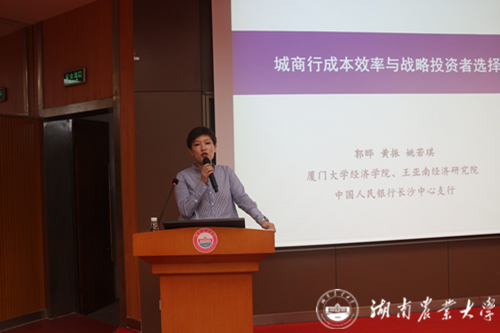 本网讯(经济学院 刘津辰)4月12日,湖南农业大学经济学院和研究生院特邀厦门大学经济学院金融系主任郭晔于十教北502举行了主题为:“城商行成本效率与战略投资者选择”的学术讲座。本场讲座由经济学院副院长罗光强教授主持,郭晔教授在金融学、货币经济学等领域的诸多建树吸引经济学院众多师生到场聆听。