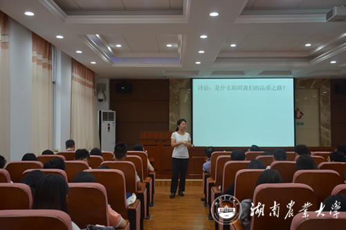 吴丹首先从中国农业现状讲起,她结合自身多年在美国生活经历,以中美贸易战这个现实背景作为切入口,以华为、中兴为例分析了中美贸易战在价值观层面的原因,从文化、法制、创新、品质四个方面剖析了中国产业面临的问题,并从品牌、技术、设计和品质四个维度提出了中国产业高端化的路径。她重点阐述了农业品质化的道路,她以中美高端手工皂生产成分、湖南黄金大米事件、东北优质大豆出口现状、德国原生态蜂蜜生产、葡萄产业链、株洲观光农业为例,分析指出要实现我国农业的品质化之路是发展有机农业、非转基因农业、原生态农业、观光农业,拉长农业产业链。她还带领大家一同探讨了阻碍中国农业产业品质的原因,提出了企业与政府共同构建良币驱逐劣币的市场方案。她最后引用毛主席一席话与大家共勉,农村是一个广阔的天地,在农村可以大有作为,她号召同学们积极投身农业,为农业发展做出开创性的贡献。