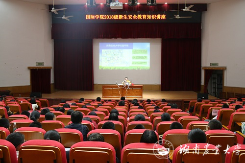 本网讯(国际学院 杨佳毓)为普及安全教育知识,使大学生更加了解安全教育的重要性,国际学院于10月18日晚,在学术报告厅召开2018级新生安全教育知识讲座。学校保卫处安全教育教研室黄敏老师应邀出席讲座,学院2018级全体新生参加讲座。