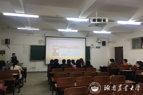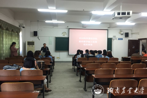 本网讯(外国语学院 李卓)10月29日上午,外国语学院在第九教学楼北406室举行教师教学能力竞赛复赛。本次竞赛由汤帮耀副院长主持,胡东平院长、国际学院岳好平院长、学院曾亚平老师、范丽群老师和许建明老师组成评审团,从教学内容、教学方法、教学组织、教学效果等方面对参赛选手进行综合评定。评分特别强调以学生为中心的教学设计和教学模式的重要性,注重信息化教学资源与手段对教学活动的支撑,关注师生间的信息交互和课堂教学效果。