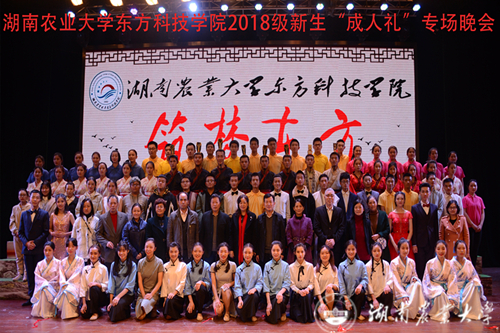 本网讯(东方科技学院 黄月飞)11月22日晚,湖南农业大学东方科技学院精心策划、组织的“筑梦东方”2018级新生“成人礼”专场晚会在校大礼堂隆重举行。校党委委员、副校长张立、校学工部部长翁波莅临现场,东方科技学院全体在家院领导出席,学院各职能部门和学部负责人、部分新生家长、全体辅导员、新生班主任及学院2018级全体新生齐聚晚会现场。