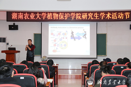本网讯(植物保护学院 苏文 刘晶 易图永)2019年1月4日下午,植物保护学院16教529多媒体室座无虚席,南方医科大学教授、国家“青年千人”计划、中国生物工程协会计算生物学与生物信息学学会副主任委员---张镇海教授在十八届研究生学术活动节上作了题为“免疫组库平台及其应用”的学术报告,报告会由植物保护学院院长戴良英主持。