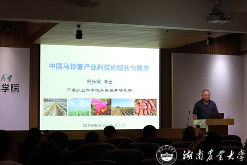本网讯(园艺园林学院 金密)4月9日下午,园艺园林学院在第十一教学楼北539会议室举办2019年第二期学术论坛活动。中国农业科学院蔬菜花卉研究所教授、湖南农业大学“神农学者”讲座教授、国家现代农业产业技术体系岗位科学家、国务院政府特殊津贴专家、中国作物学会马铃薯专业委员会副主任委员、国家薯类作物研究中心栽培研究室主任熊兴耀教授作了题为《中国马铃薯产业科技的现状与展望》的精彩报告。学院全体领导、60余位教师和70余位研究生以及本科生参加了此次论坛。论坛由杨国顺院长主持。
