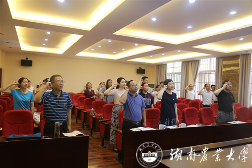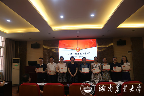 首先,李明贤书记代表学院党委为6月入党的欧阳涛、刘辉、黄亚林、罗荷花、张来春、高洁、许慧、梅淑元、刘洋等教工党员发送了“政治生日贺卡”。 随后,欧阳涛教授代表过生日的党员发表讲话。他表明,党员不只是一种政治身份,更是一种政治责任。我们要时刻牢记自己是一名党员,时刻牢记党员的责任,反思自己的所作所为是否符合党员的身份,要不负厚望、不辱使命、对党忠诚、积极工作。接着,在吴峰副书记的领誓下,全体党员重温了“入党誓词”。