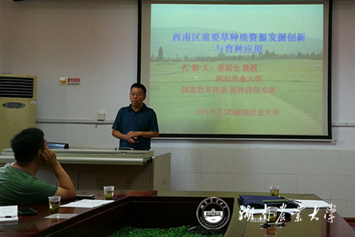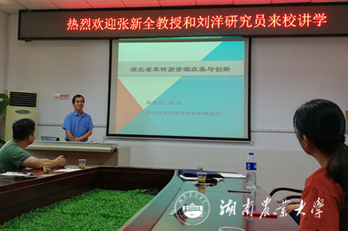 本网讯(农学院 曾宁波 穆麟)8月20日下午,国家牧草体系育种岗位专家、四川农业大学教授张新全,湖北省农科院畜牧兽医研究所研究员刘洋应邀来我校讲学。张新全、刘洋分别作了题为“西南地区重要草种资源发掘创新与育种应用”及“湖北省草种质资源收集与创新”的主题报告,讲座由农学院党委书记周其林主持,学院草学专业教师及部分研究生、本科生参加。