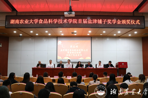 本网讯(食科学院 盛洁 李宇嘉)11月5日下午,食品科学技术学院首届盐津铺子奖学金颁奖仪式在第八教学楼学海厅举行。副校长张立、盐津铺子食品股份有限公司常务副总经理杨林广,校友办负责人、食品科学技术学院班子成员及获奖学生代表参加活动。