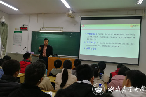 马先锋讲授了《专业专题讲座》课程。他结合丰富的科学研究、生产实践图片以及水果实物,引导学生认真观察、细细品尝、分组讨论,组织各组代表对研讨出的共性问题进行陈述。最后,他对同学们提出的问题和观点进行归纳总结,并结合研究课题实例和相关学科知识进行系统讲解,有逻辑、有层次地引领学生掌握新知识。