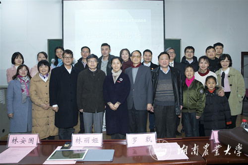 本网讯(外语院 李婷玉)12月21日上午,由人文与外语学院承办的2019年日本文化论坛在老T3教室举行。湖南省赴日研修生联谊会会长林安国、湖南省赴日研修生联谊会常务副会长罗戟、副会长何鸣放、周建龙、高瞻、钟菊君,湖南省生态环境厅调研员周立新,长沙环境保护职业技术学院副教授樊晶晶,湖南省肿瘤医院副主任医师刘高明,人文与外语学院党委书记林丽娅出席,学院日语系全体教师,日语系专业学生参加论坛。