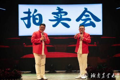 小小的物件,包含着大大的寓意。一件实验服、一根头发、一辆自行车,都是园艺前辈们成长的见证。由校友、湖南广播电台主持人郝长虹、钟泽优带来的相声《拍卖》,在幽默风趣的调侃中表达着对园艺前辈们朝乾夕惕、顽强拼搏的敬佩之情。
