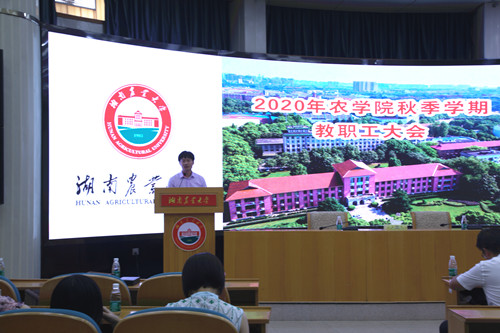 本网讯(农学院 刘宁芳)8月25日下午,农学院在生科楼国际会议厅召开2020秋季学期全院教职工大会,校党委书记陈弘出席,会议由农学院党委书记周其林主持。