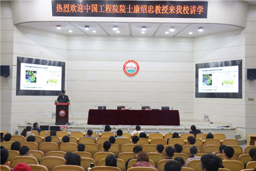 本网讯(水利与土木工程学院 翟光辉 刘拥斌)10月14日下午,中国工程院院士、中国农业大学康绍忠教授应邀做客我校研究生学术活动节,在学校图书馆大成厅作题为《多尺度水热碳通量检测模拟及对变化环境的响应与调控》的学术报告。会议由副校长邹冬生主持。水利与土木工程学院全体领导班子及学院教师、研究生以及本科生代表共200余人参加报告会。